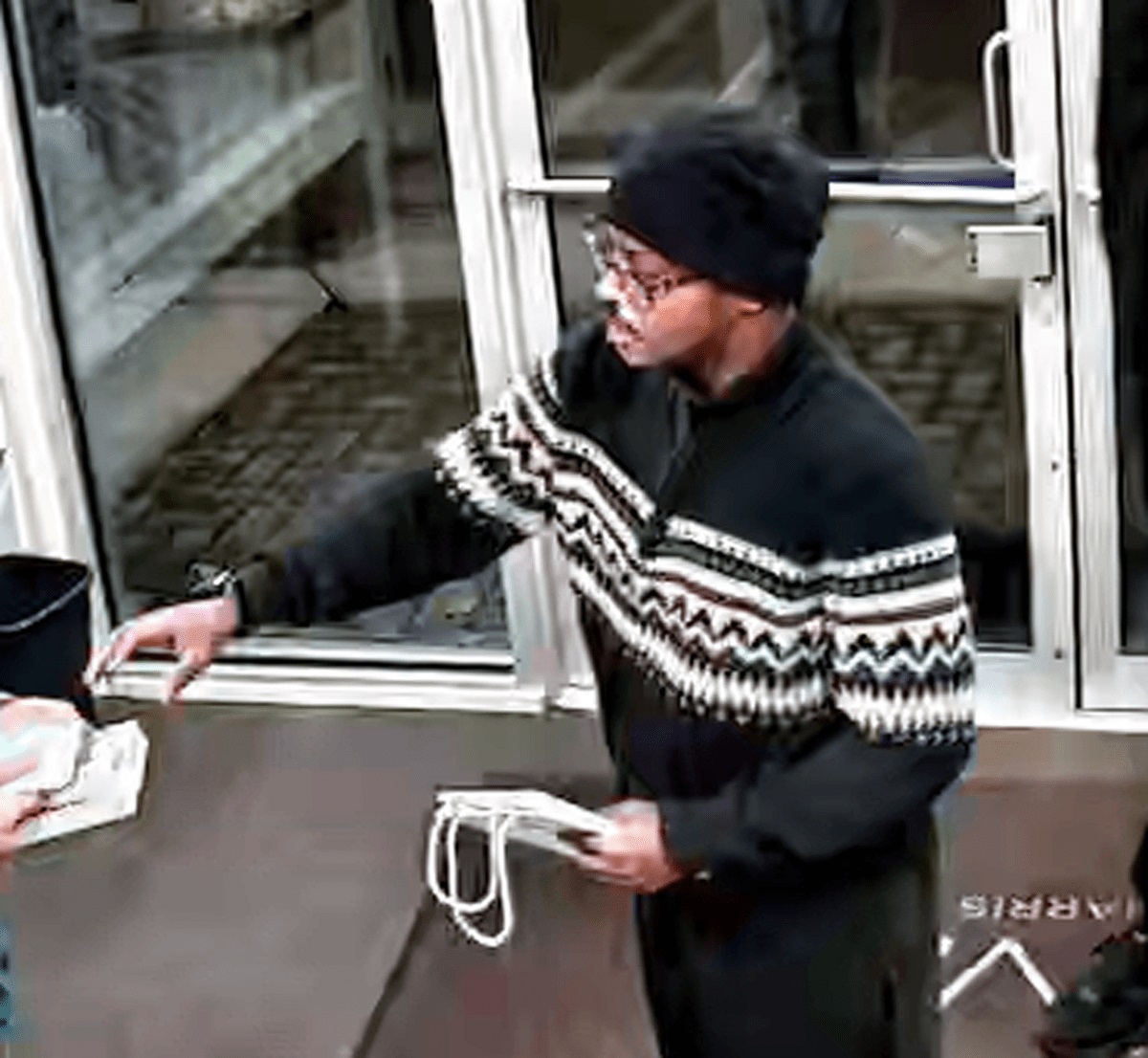 - Wearing glasses, a dark toque, and a black pullover with white markings