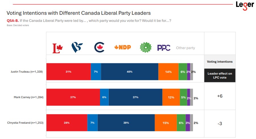With Carney as leader, Liberal support would rise to 37% (+6), while Conservative support would drop to 37%, suggesting Carney could attract voters and improve the party’s electoral chances.